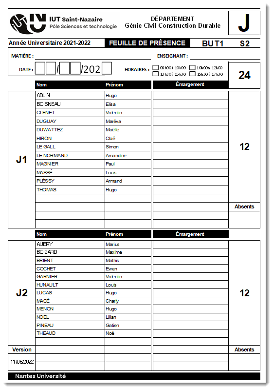 qui permet de générer les feuilles de présence des différents groupes d'étudiants à partir d'une liste globale (provenant de Scodoc par exemple). Elle génère également une feuille de présence pour l'émargement en amphithéâtre pour la promotion toute entière.Quelles sont les différentes étapes ?