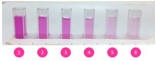 Voici un exemple d'une gamme de dilution d'une solution de permanganate de potassium (KMnO4) de la solution la plus concentrée (1) vers la solution la moins concentrée (6) et les données correspondantes.