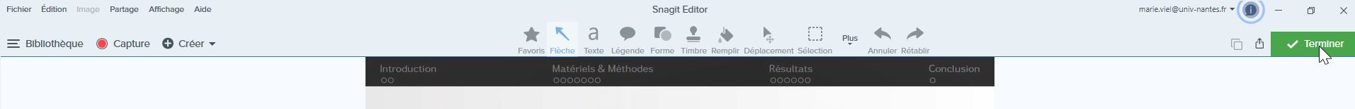 Lorsque vous aurez terminé l'enregistrement, cliquer sur "Terminer l'enregistrement". Une page de Snagit Editor s'ouvrira. Vous pourrez regarder l'enregistrement que vous venez de réaliser et éventuellement le modifier. Quand vous aurez terminé, cliqué sur "Terminer" pour compiler votre vidéo au format .mp4.