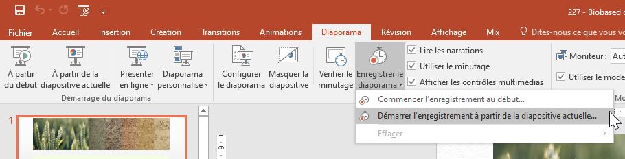 1) Soit vous avez réalisé votre diaporama sur Power Point. Vous pouvez directement enregistrer votre bande son à partir du diaporama. Pour cela, vous devez cliquer sur "Enregistrer le diaporama" qui se trouve dans l'onglet "Diaporama". Vous avez la possibilité d'enregistrer la présentation en une ou plusieurs fois. Pour utiliser votre souris comme pointeur, il vous suffit d'appuyer sur CTRL tout en faisant un clic gauche avec votre souris.