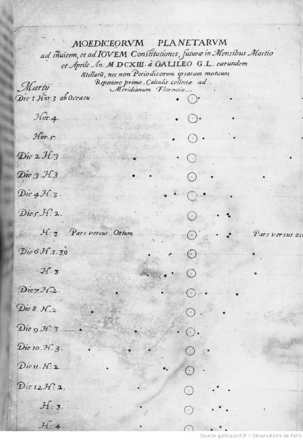 Observations des satellites de Jupiter par Galilée en mars et avril 1613 - Source Gallica