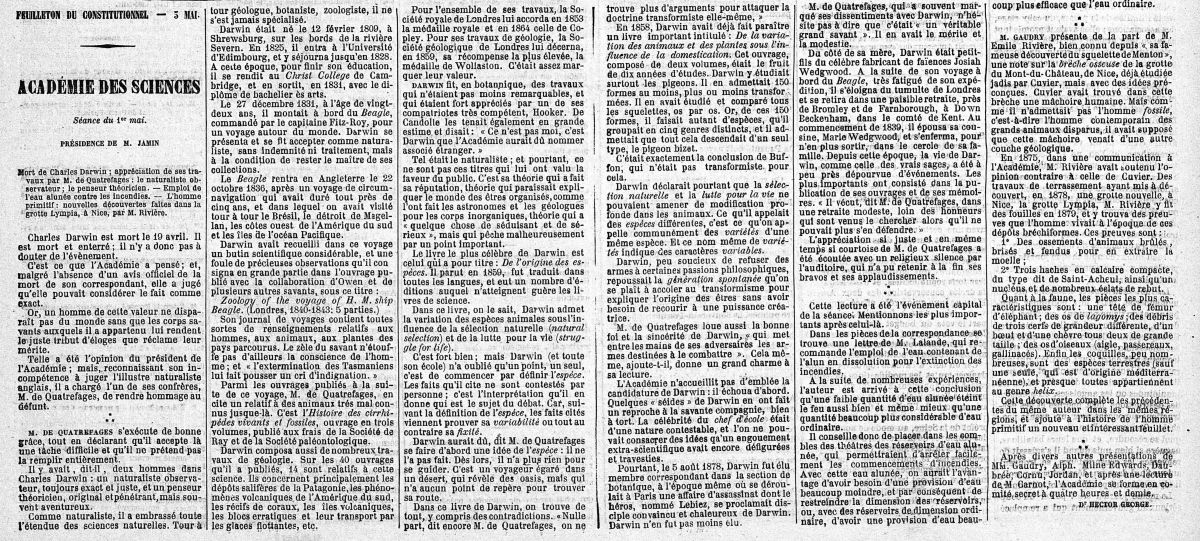 Article du Journal "Le Constitutionnel" du 03 mai 1882 annonçant la mort de Charles Darwin - Source Gallica